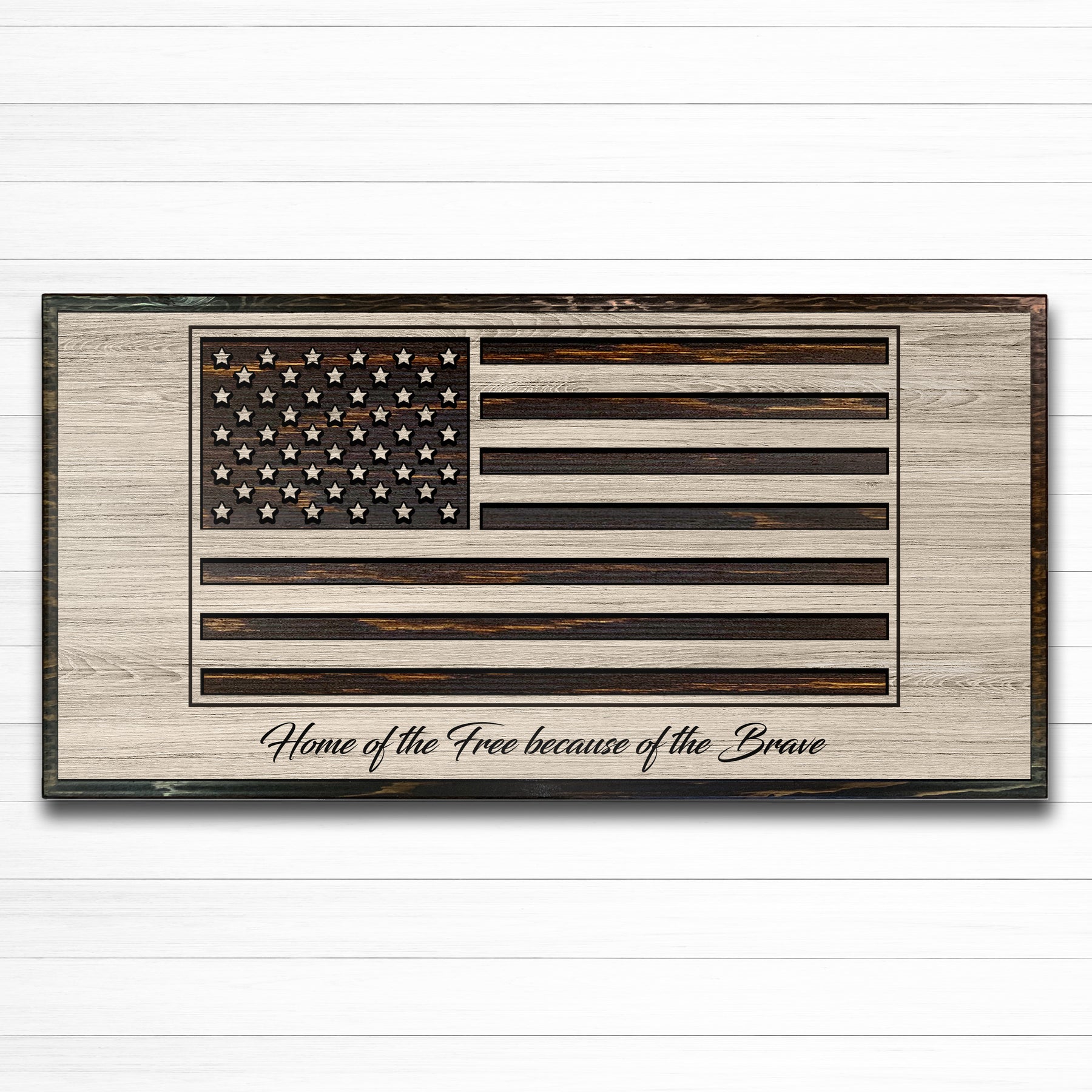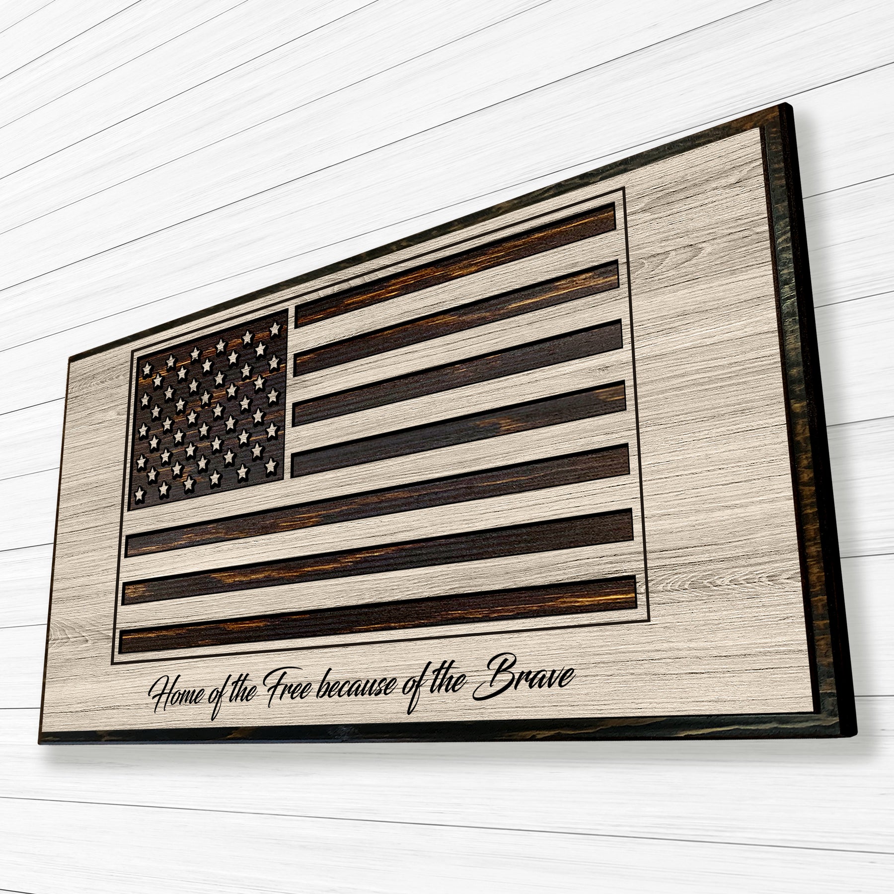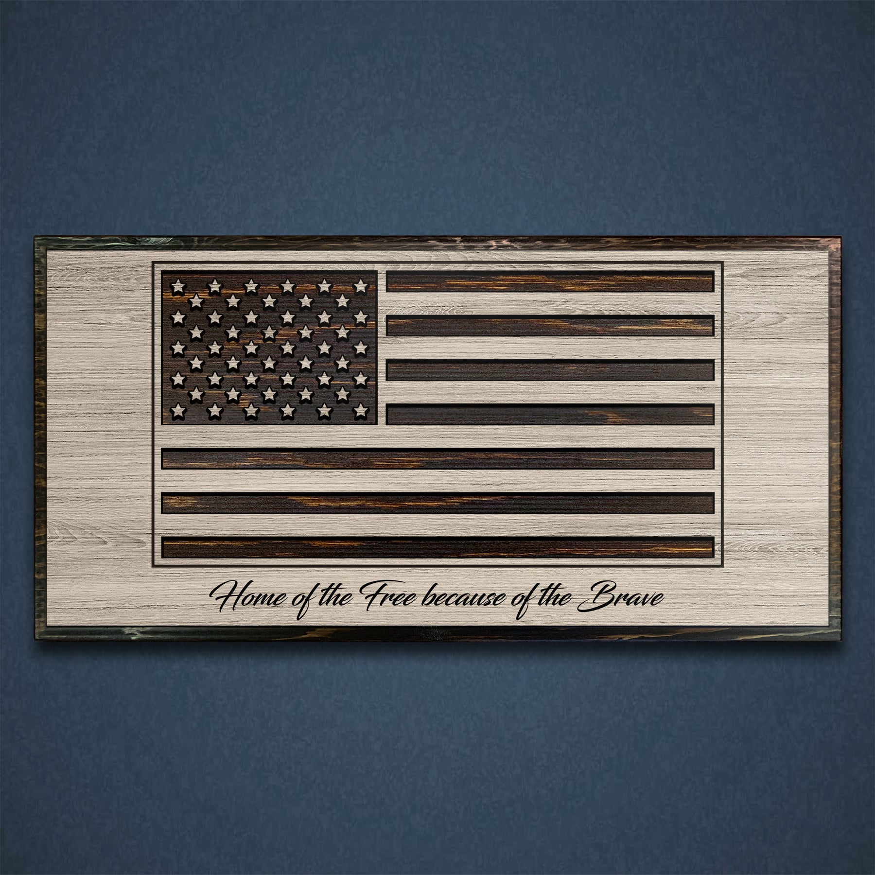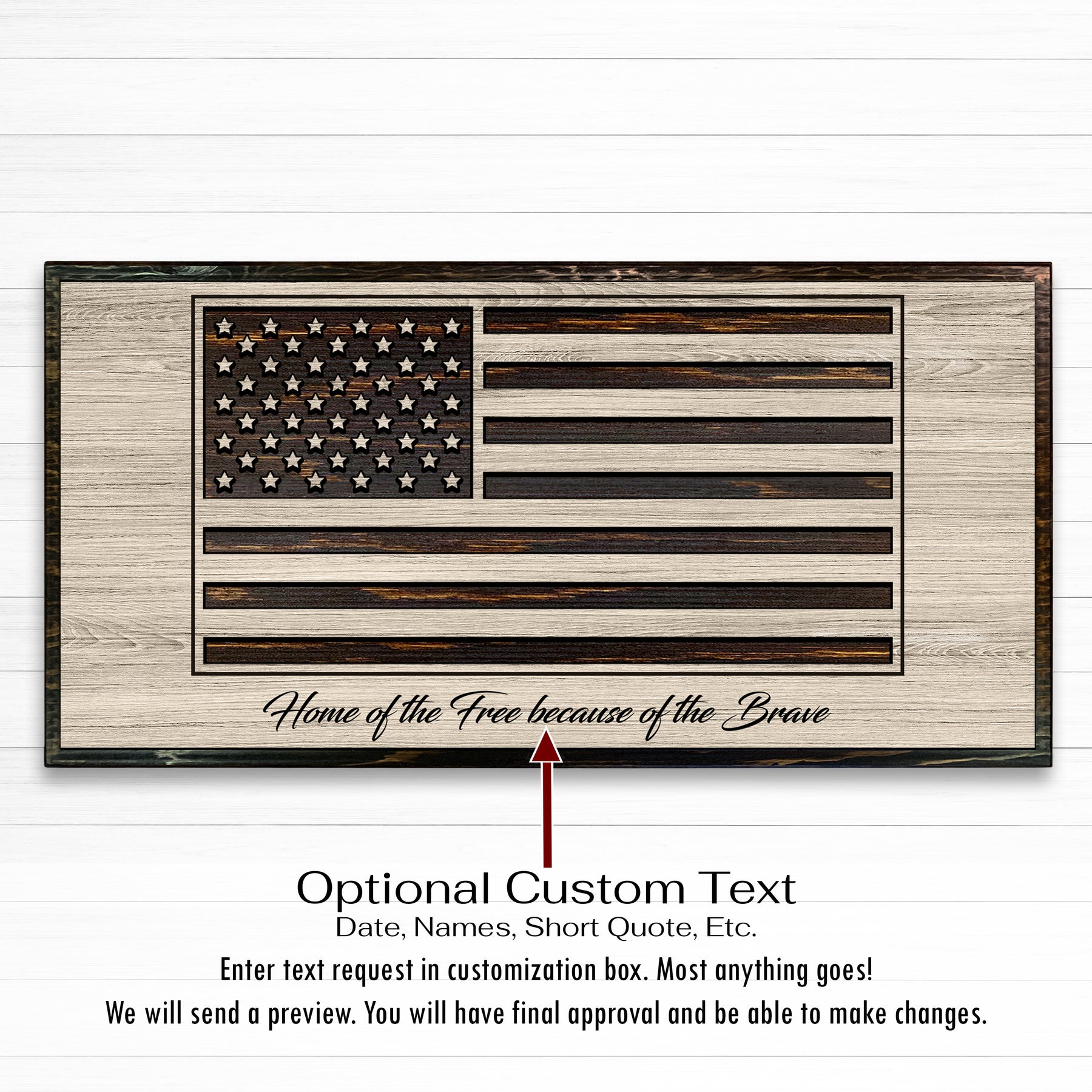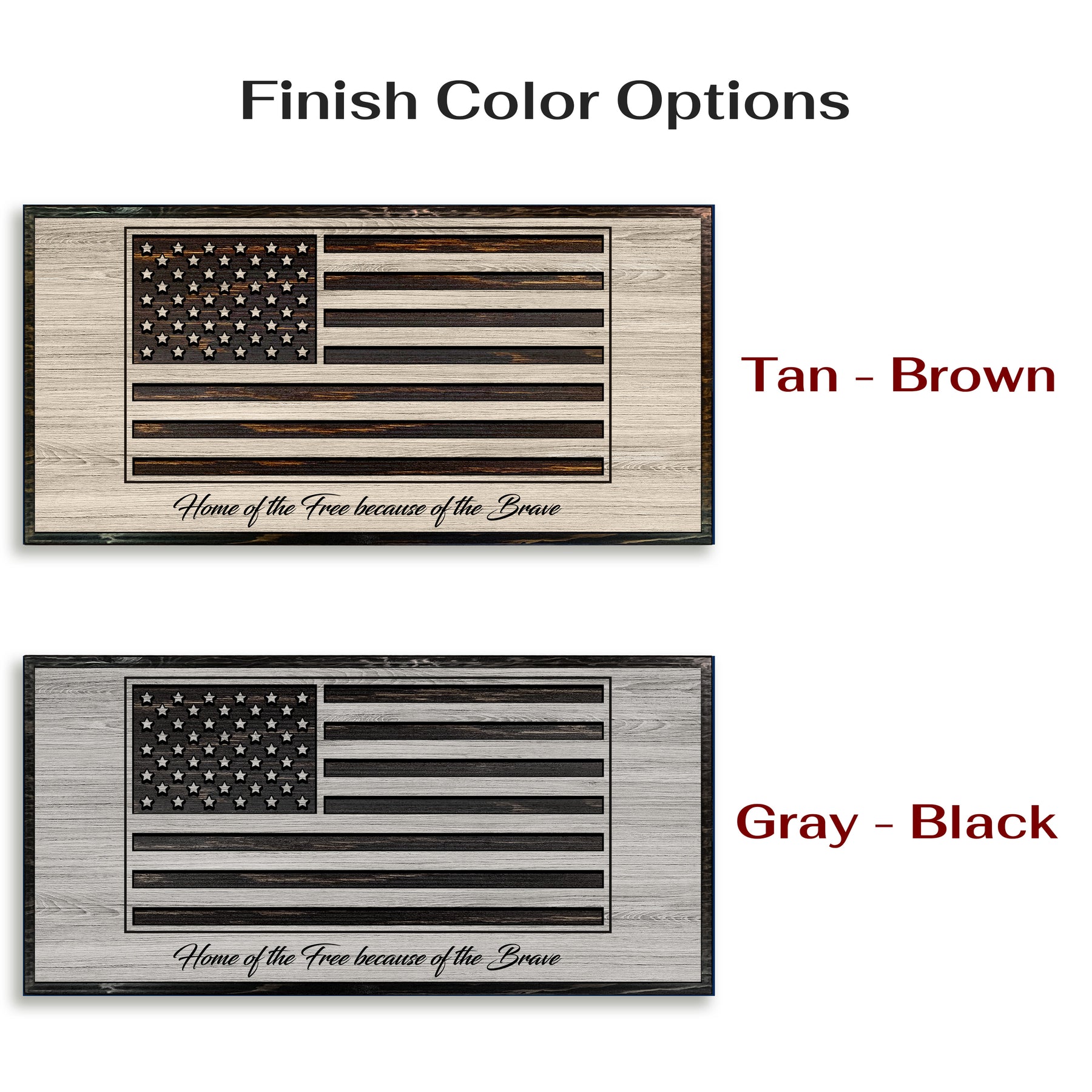 Every piece is made to order and finished by hand, allowing the natural grain of the wood to enhance the design—no two flags are ever exactly alike. Choose from a range of sizes, two stain colors, and finish styles to match your space, whether you’re outfitting a home, office, shop, firehouse, or veteran-owned business. Optional customizations, including engraved text or special dates, make each flag a meaningful and personal statement.