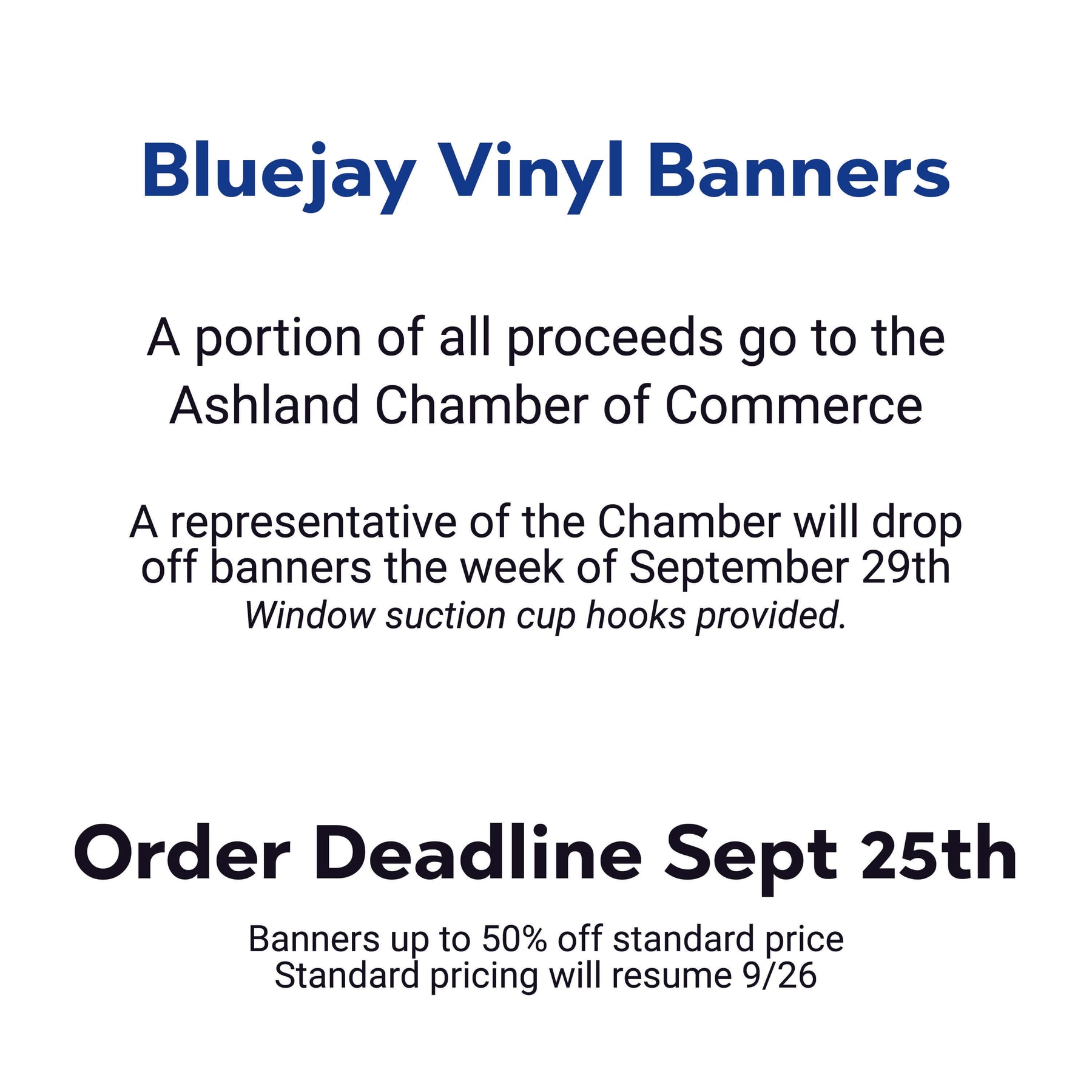 A portion of all proceeds go to the Ashland Chamber of Commerce. A representative of the Chamber will drop off banners the week of September 29th. Window suction cup hooks will be provided.